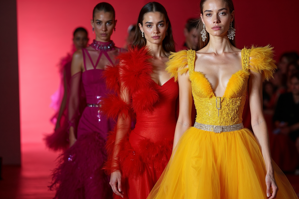 The most significant fuel for Modern Maximalism is the collective need for Dopamine Dressing. Fashion has always reacted to the economy, and maximalist trends typically emerge following periods of financial or social distress (as seen after the 2008 recession). Bold colors and theatrical styles serve as a visual antidote to anxiety, signaling optimism and resilience. The Spring/Summer 2026 runways confirmed the death of all-beige everything. Designers from major houses are trading their neutrals for saturated, bold hues—Electric Fuchsia, Lava Falls Red, and high-octane yellows—often paired in combinations previously considered clashing. This is not simple color; it’s graphic color-blocking that intentionally disrupts traditional harmony, making a confident, energized statement. The color palette itself is a form of emotional expression.